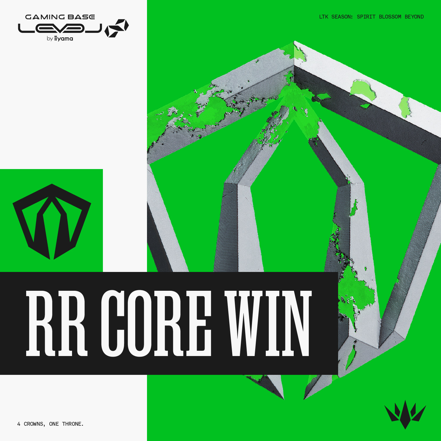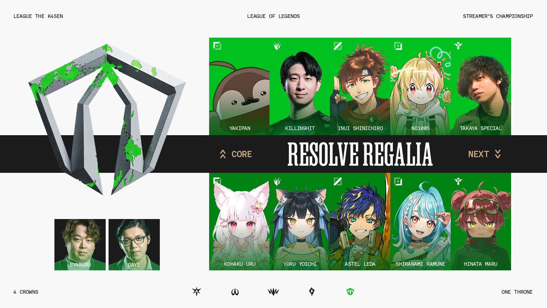 League of Legendsのルーンをモチーフに「DOMINATION CROWN」、「PRECISION DIADEM」、「SORCERY TIARA」、「RESOLVE REGALIA」の4チームを命名、4チームのロゴの欠片が集まるとリーグロゴが浮かび上がる仕組みを作りました。