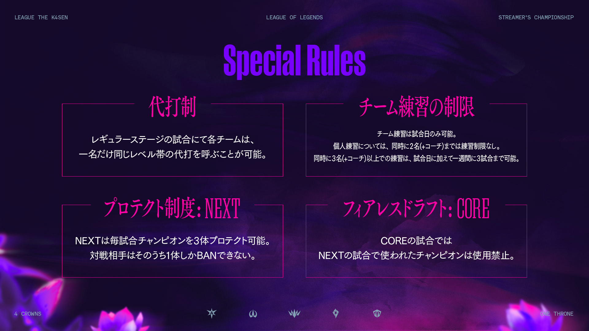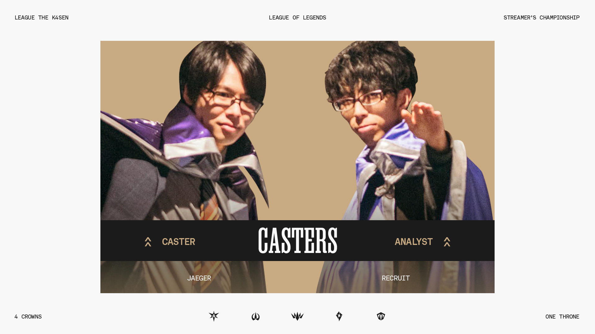「4 Crowns, One Throne.」をリーグのスローガンとし、それぞれ冠を有する4チームが、1つの王座を争って戦うというテーマを設定しました。