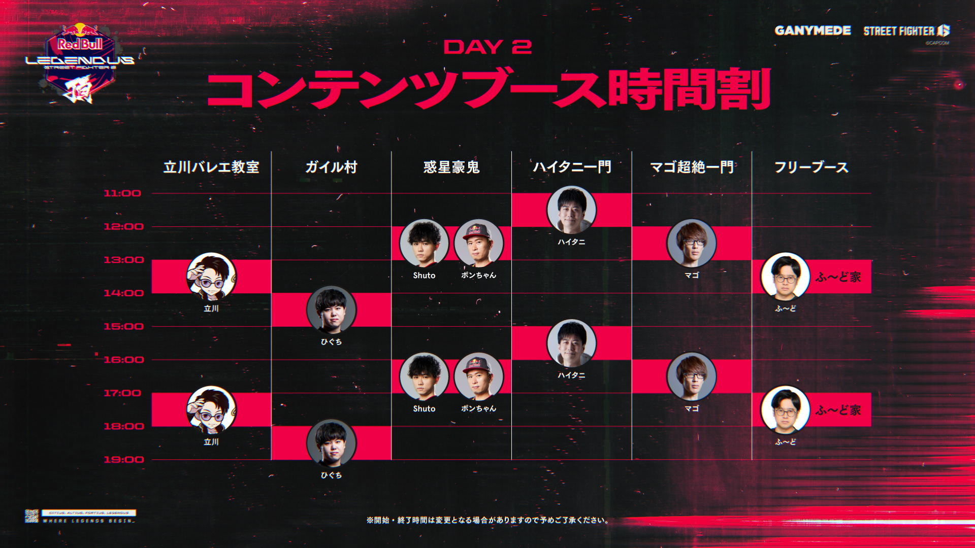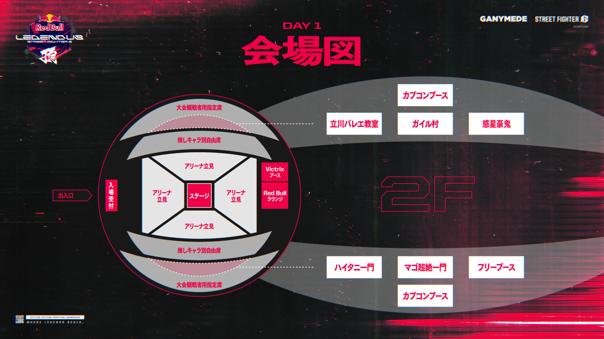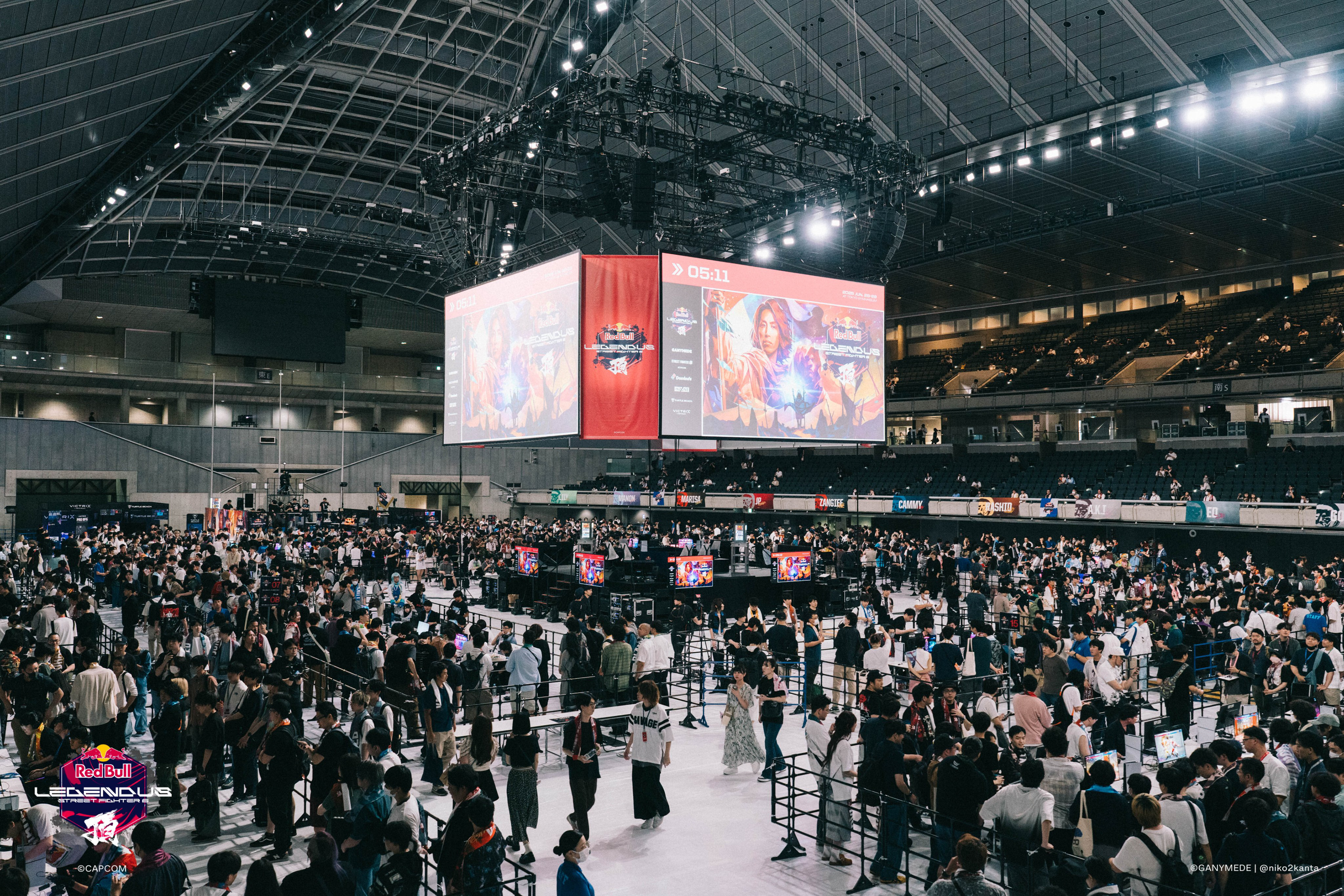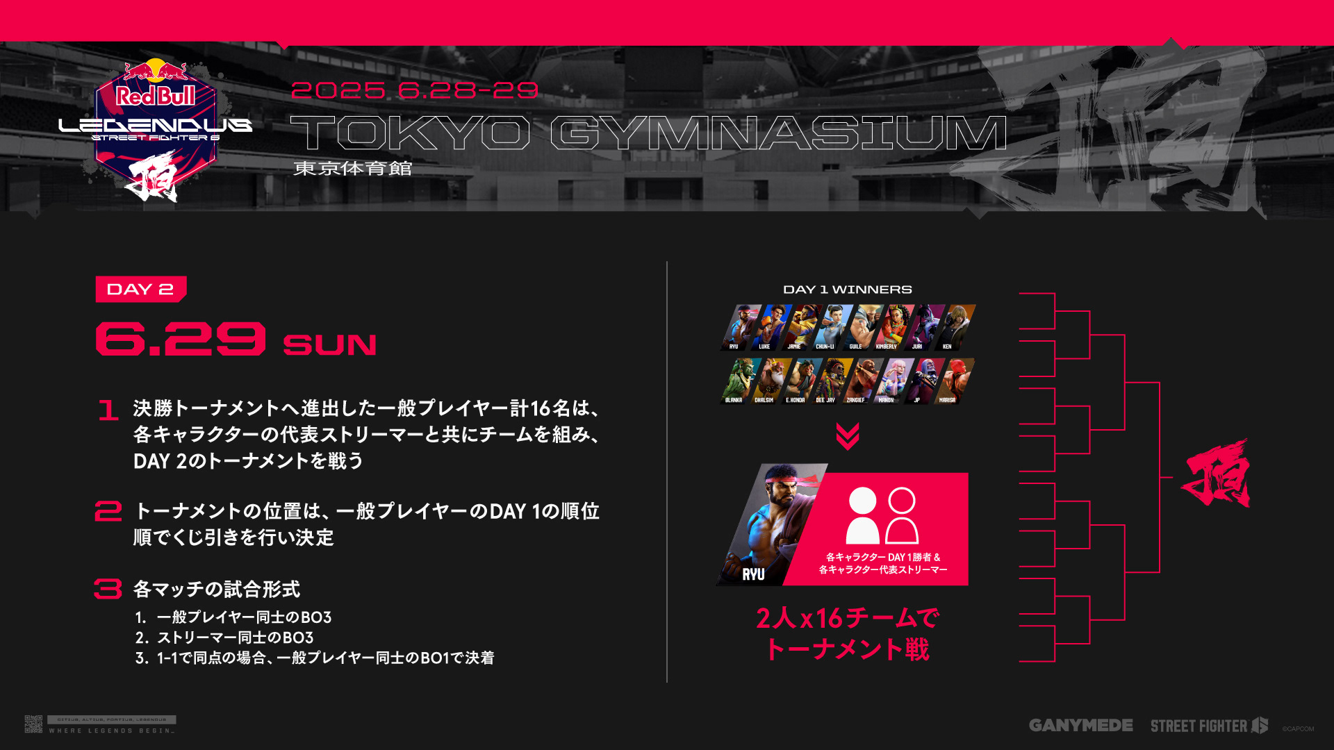 第10回目では、一般プレイヤーも参加可能な大型オフラインイベント『Red Bull LEGENDUS STREET FIGHTER 6 頂』が開催。東京体育館を舞台に、DAY 1では最大1024名による一般プレイヤー参加型のオープントーナメント、DAY 2ではDAY 1通過者16名+各キャラクター代表ストリーマーによるチーム戦が行われる変則的なフォーマットに挑戦しました。
