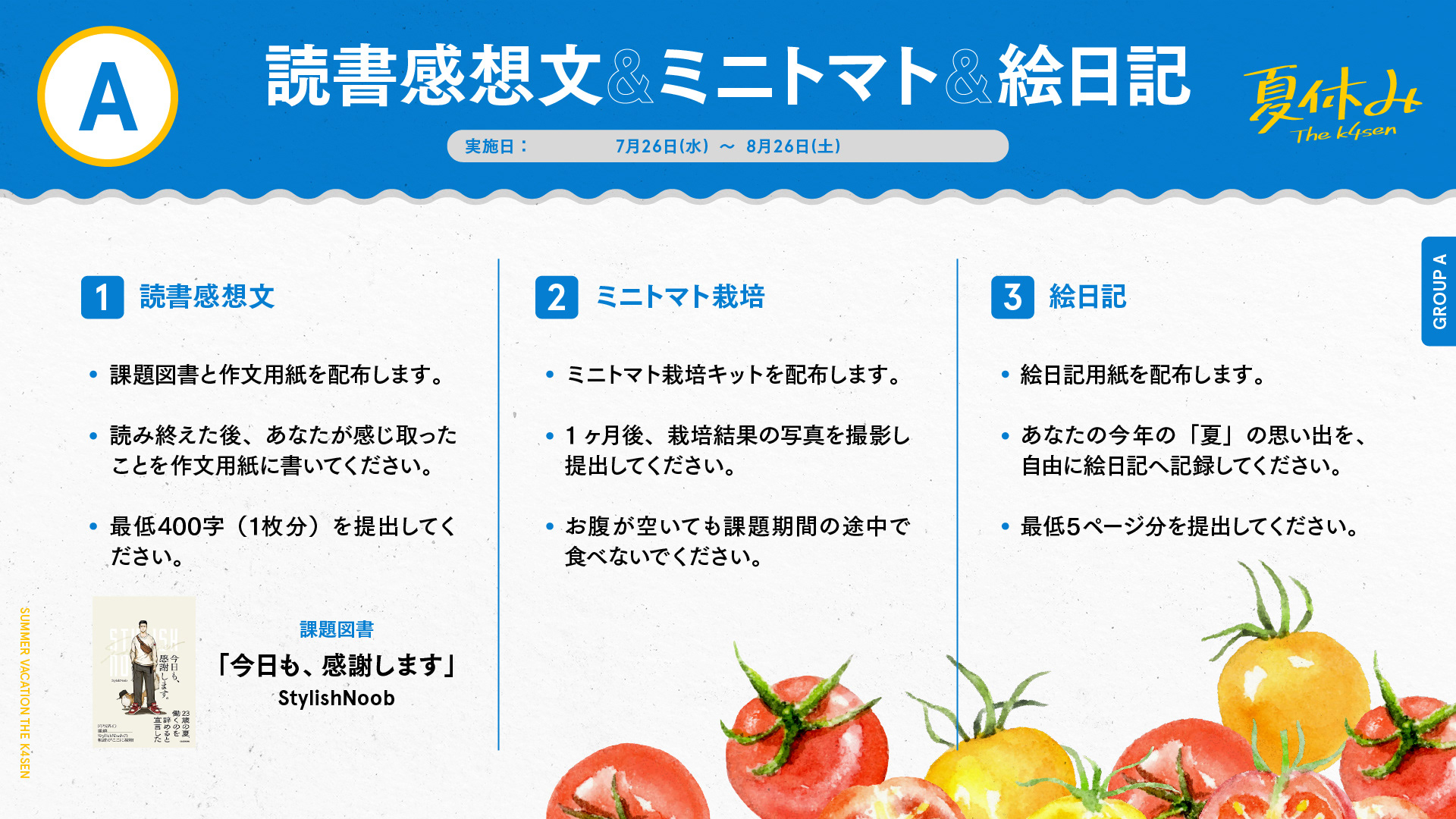 第10回目では配信者30名を集めて「夏休み」が開催され、参加者は「読書感想文」、「ミニトマトの栽培」、「俳句」、「写生」、「絵日記」の課題に取り組みました。
