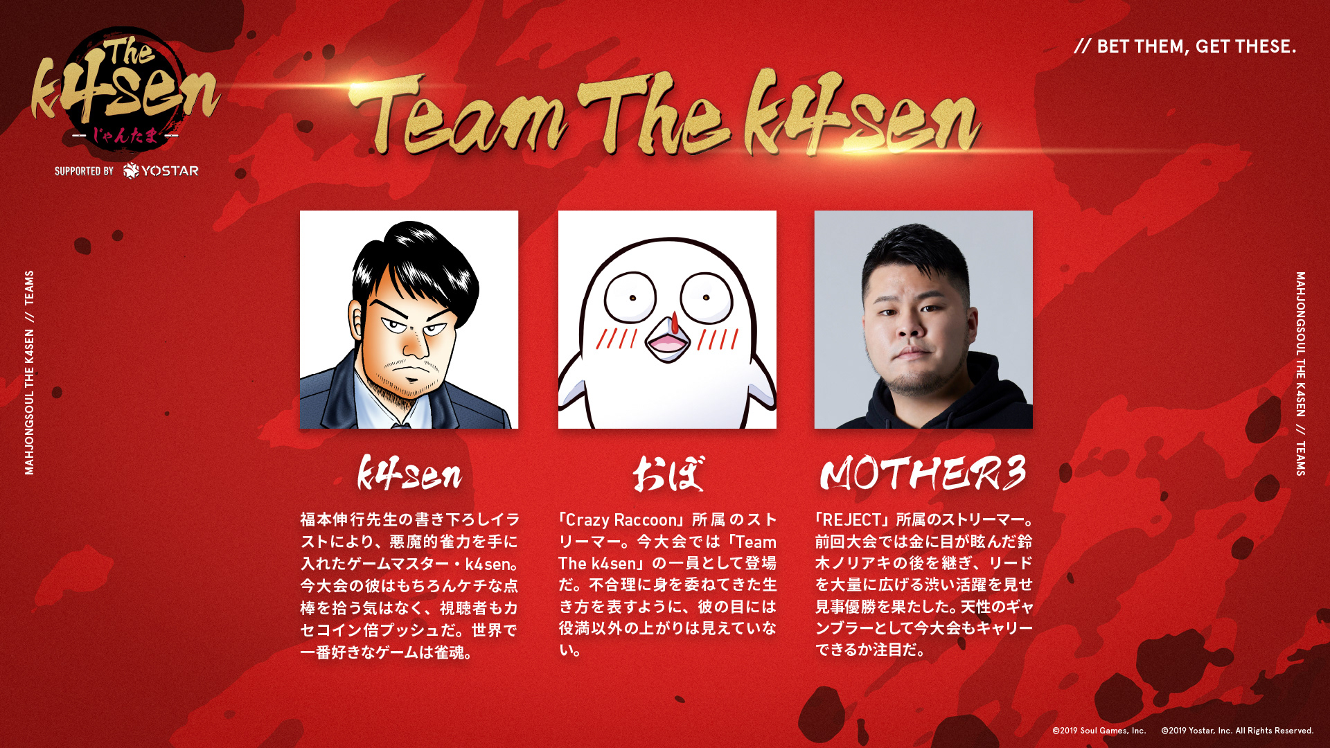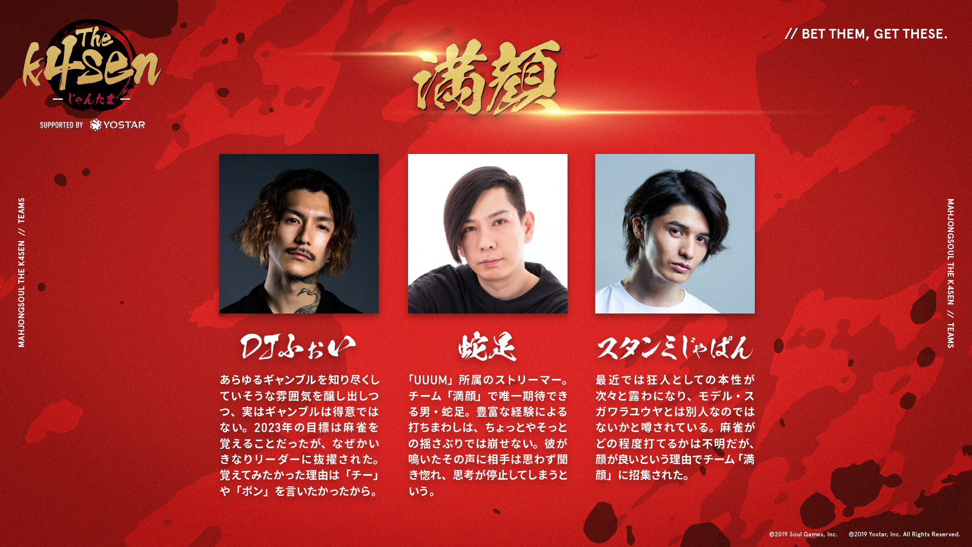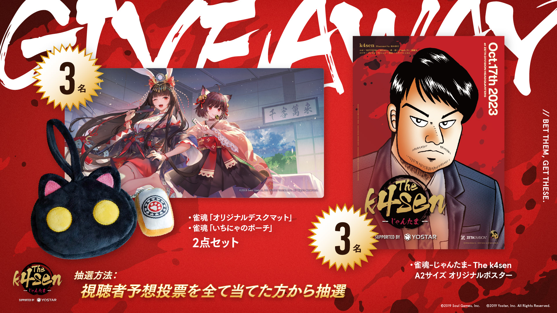 第12回目は、株式会社Yostarが手掛ける萌え系対戦型麻雀ゲーム「雀魂-じゃんたま-」を用いた『雀魂-じゃんたま- The k4sen Supported by Yostar』が2年連続で開催され、本イベントのアートディレクション・デザイン制作を担当しました。