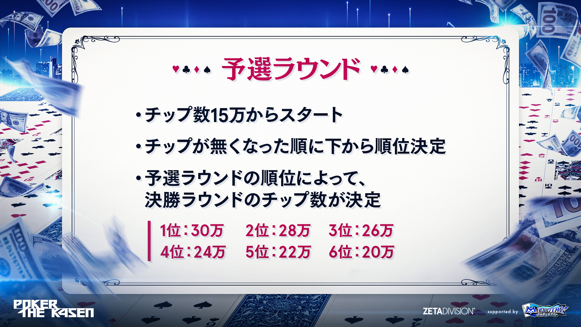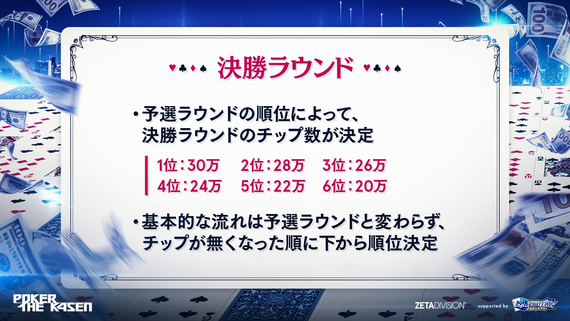 ポーカーが舞台ということでグランド・イリュージョンの世界をオマージュ。華麗なトークで汚れたチップを盗み、視聴者に還元する犯罪集団 k・フォー・ワースメンとして、一夜限りの戦いが行われました。