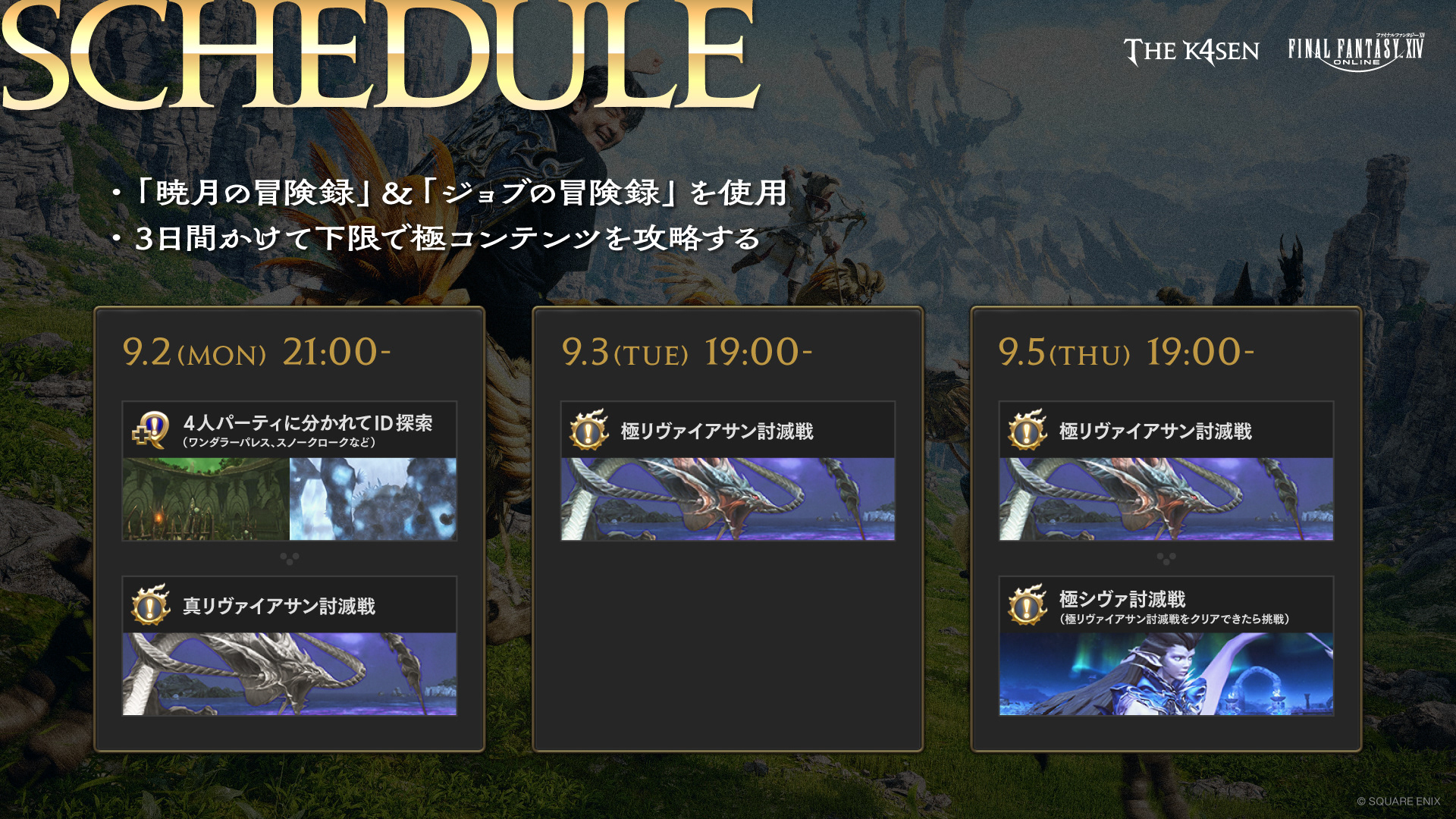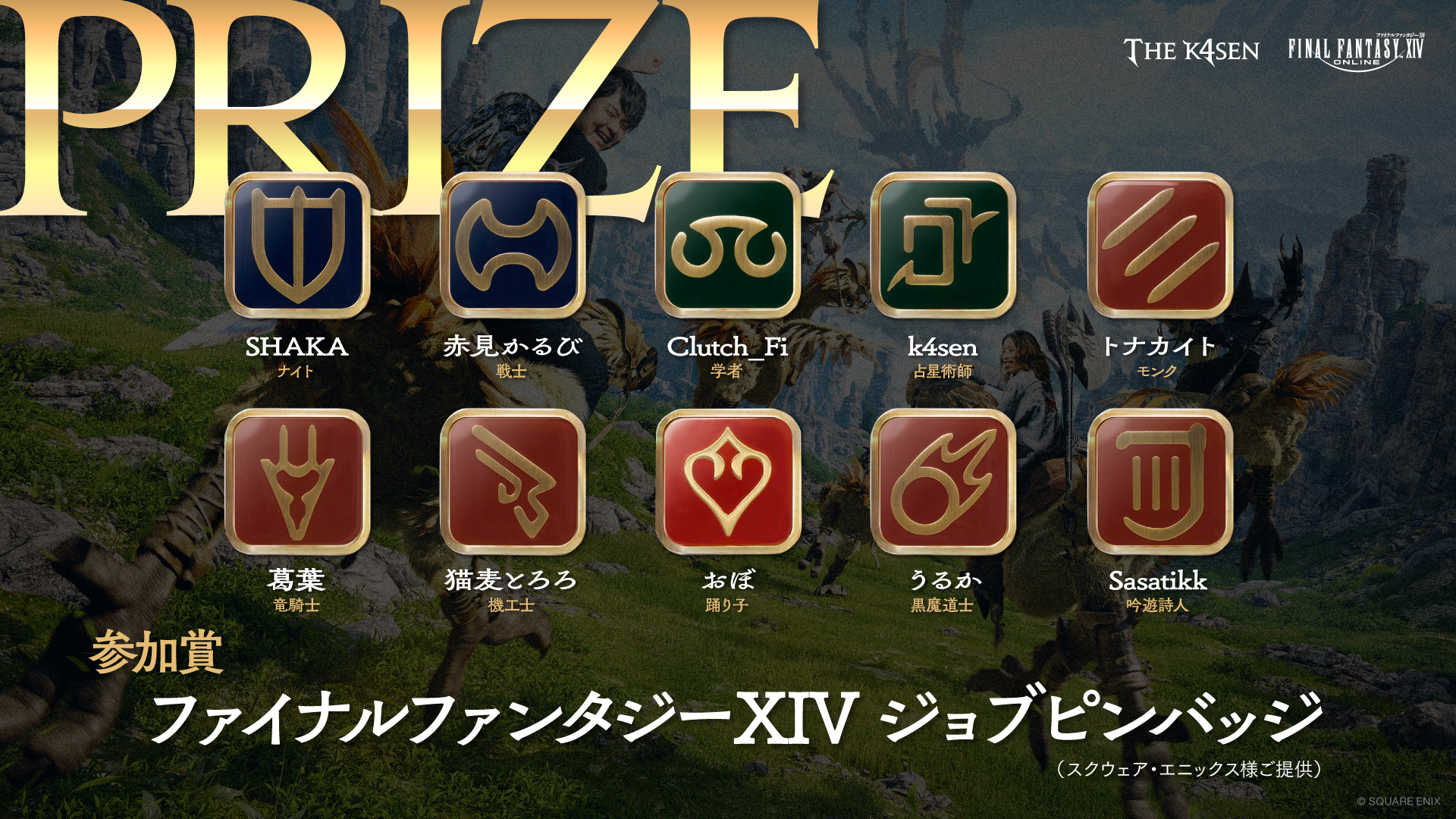 第23回目は、スクウェア・エニックスが開発したファイナルファンタジーシリーズ第14作目にあたるMMORPG「ファイナルファンタジーXIV」を用いた『ファイナルファンタジーXIV The k4sen』が開催されました。後に幾度も開催される「FF14の極コンテンツを下限で攻略する」というフォーマットを生み出した記念すべき回です。