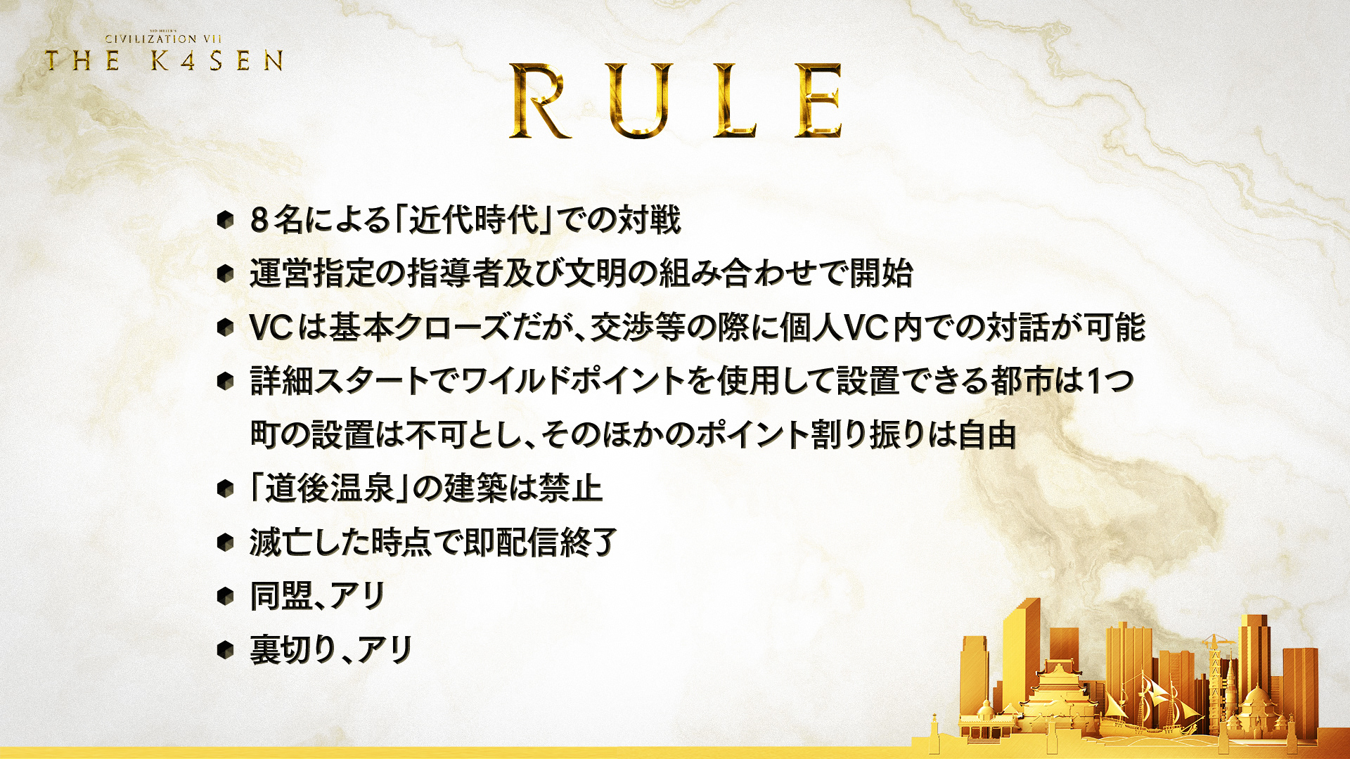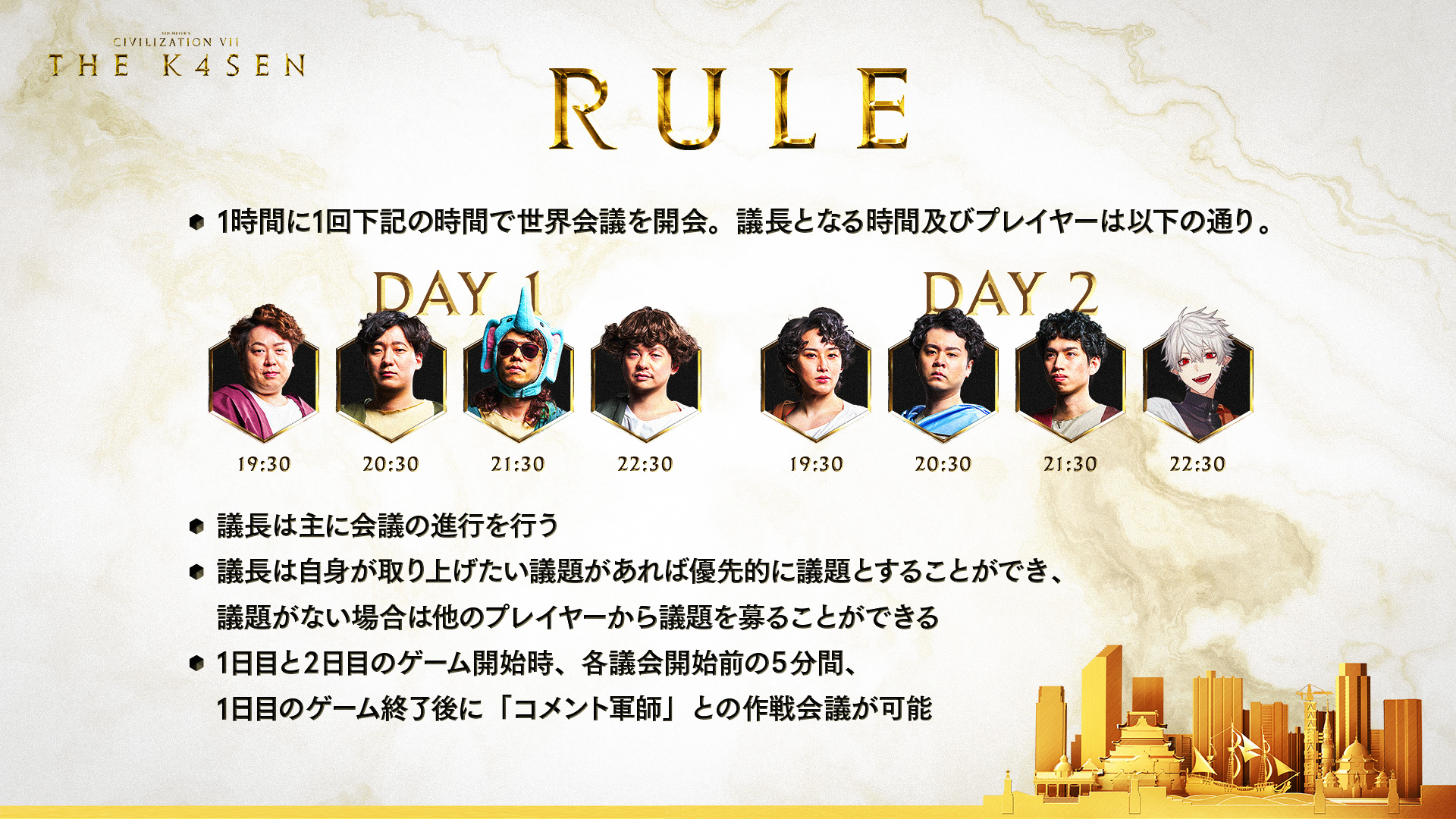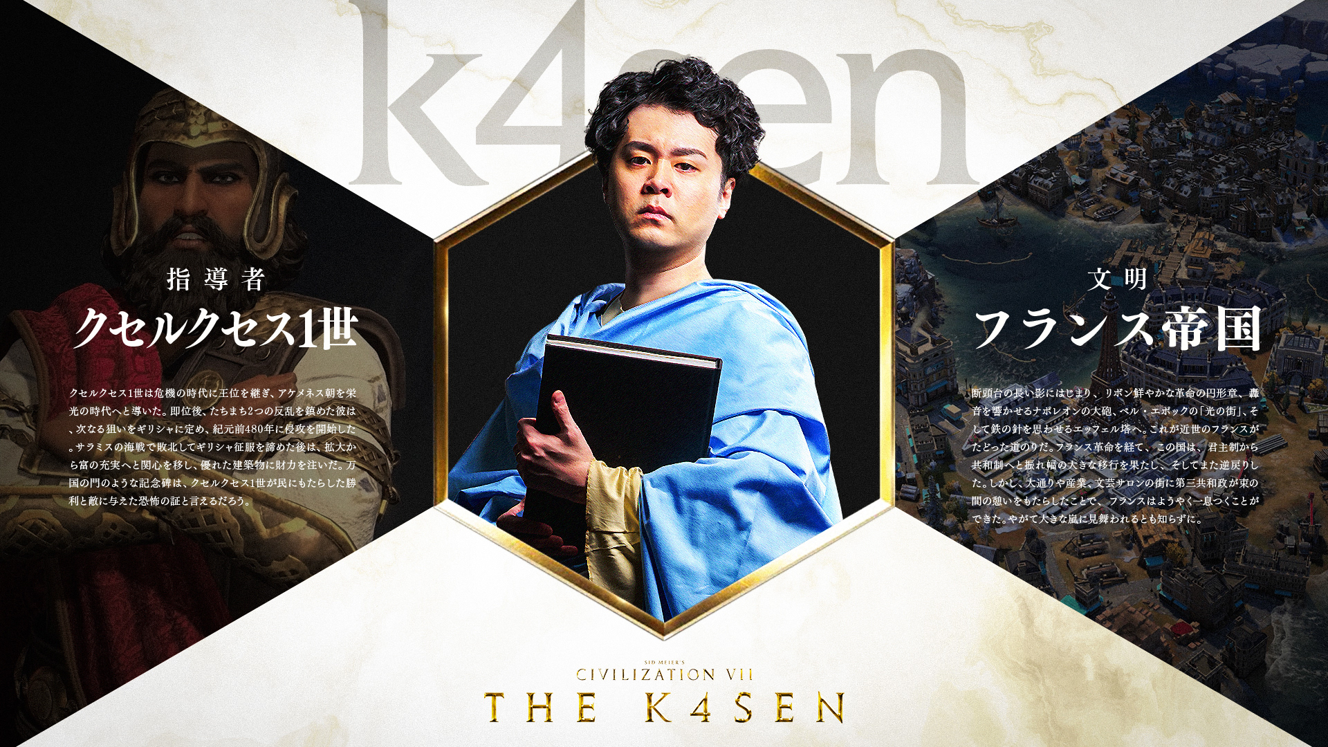 第31回目は、2K Gamesが送る歴史をテーマにしたストラテジーゲームシリーズ最新作「Sid Meier’s Civilization VII」を用いて『Sid Meier’s Civilization VII The k4sen』を開催、偉大な8人の指導者が集結しました。