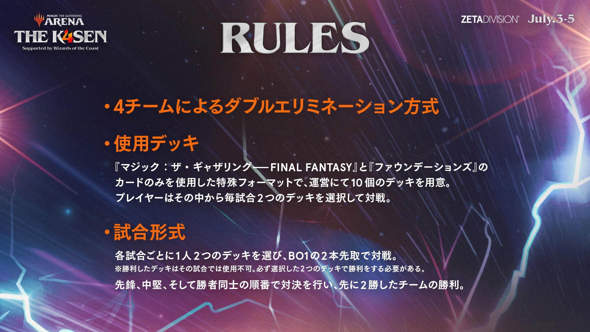 第37回目は、全世界で4,000万人を超えるファンを持つ戦略TCG「マジック:ザ・ギャザリング」のPC&モバイルゲーム「MTG Arena」を用いた『MTG Arena The k4sen Supported by Wizards of the Coast』が開催されました。