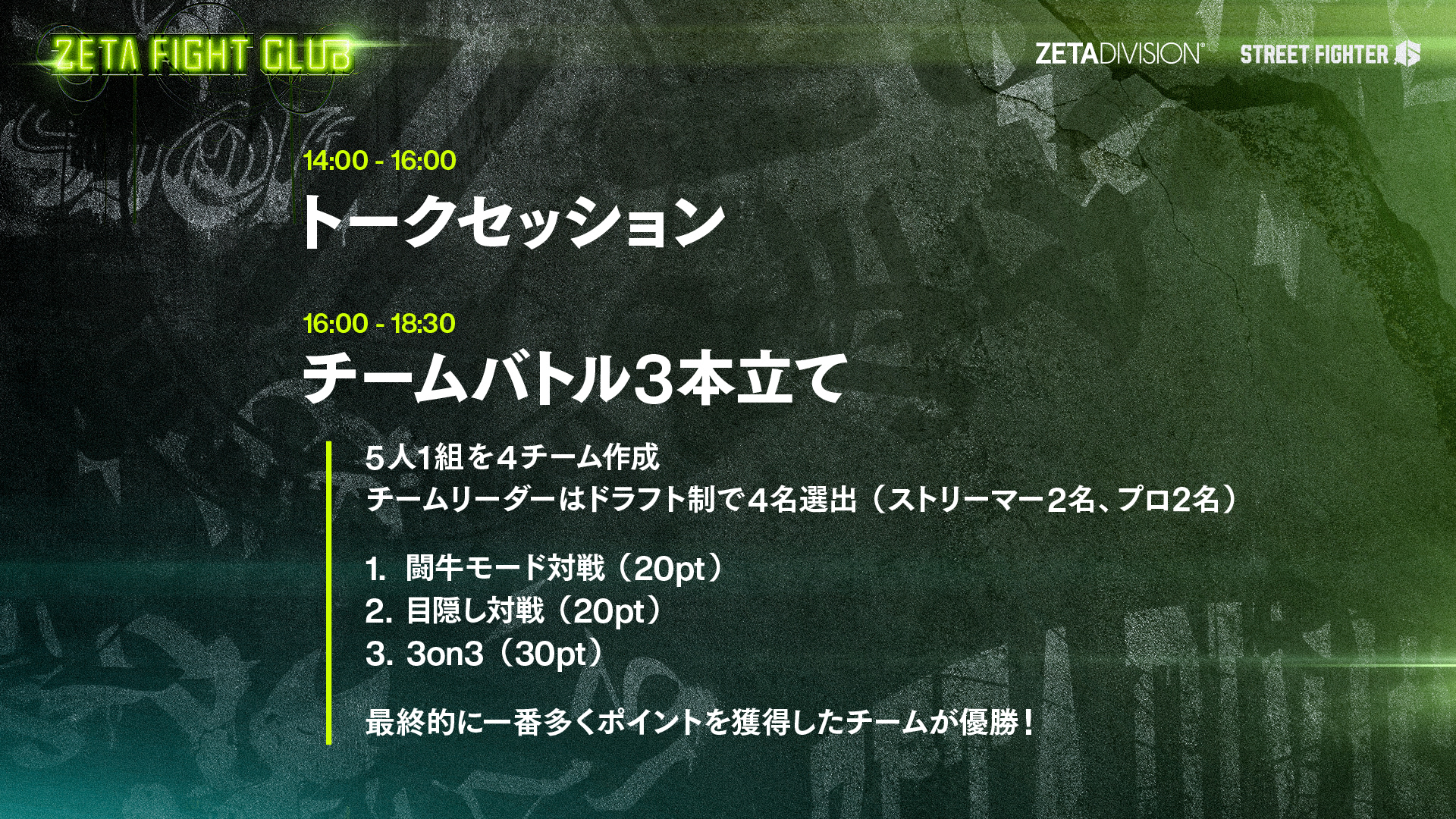 『ZETA FIGHT CLUB』は闘いを求め熱きファイター達が集う場所をテーマとした、ZETA DIVISIONが主催する完全招待制の対戦会イベントです。